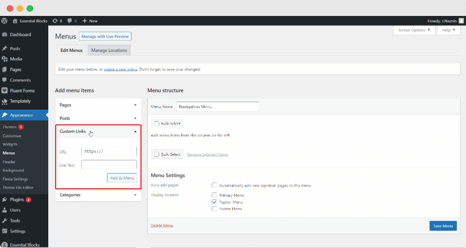 You will need to click the option for ‘Custom Links’ in the left column. This will open the settings menu for the link to help you create the WordPress logout link that you can customize according to your preference and set in the nav (Navigation) bar.
